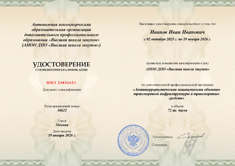 Повышение квалификации, 72 академических часов, 7 модулей: нормативно-правовые основы противодействия терроризму, анализ угроз и рисков, функциональные обязанности ответственных, инженерно-техническая укрепленность, документооборот и действия персонала при ЧС. Онлайн-обучение в в Луганске с итоговой аттестацией.