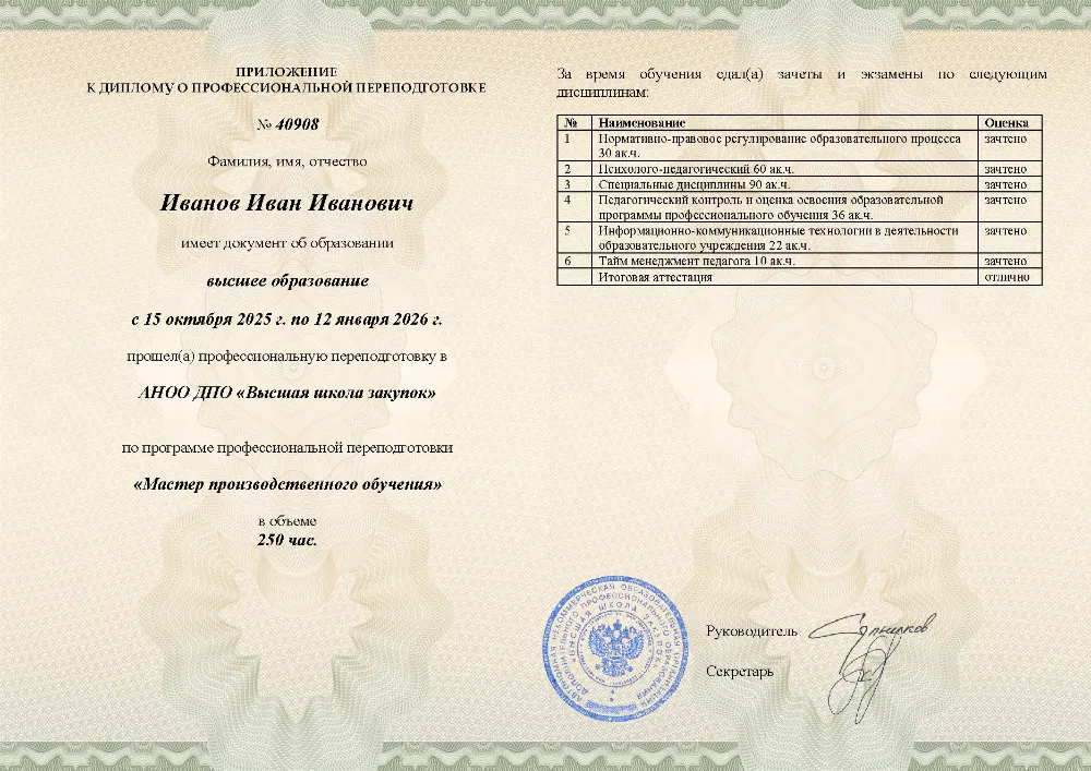 Профессиональная переподготовка, 250 академических часов, 11 модулей: нормативно-правовое обеспечение, основы педагогики и психологии, проектирование образовательных программ, методика профессионального обучения, педагогический контроль, применение ИКТ и тайм-менеджмент педагога. Онлайн-обучение в в Луганске с итоговой аттестацией.