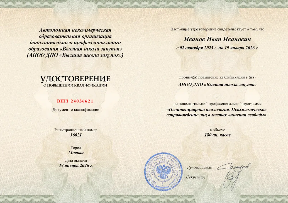 Повышение квалификации, 120 академических часов, 14 модулей: теоретико-методологические основы и нормативное обеспечение, криминальная и виктимологическая психология, судебно-психологическая экспертиза, психология следствия и судебного процесса, работа с осужденными и профилактика правонарушений. Онлайн-обучение в в Луганске с итоговой аттестацией.