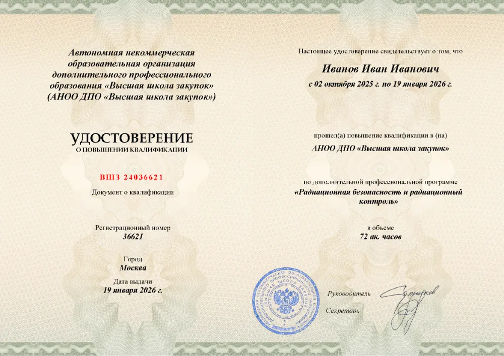 Повышение квалификации, 72 академических часа, 9 модулей: законодательное и нормативное обеспечение, дозиметрия и приборная база, лицензирование, методики радиационной защиты при эксплуатации и обслуживании установок, действия при авариях и ЧС. Онлайн-обучение в в Луганске с итоговой аттестацией.