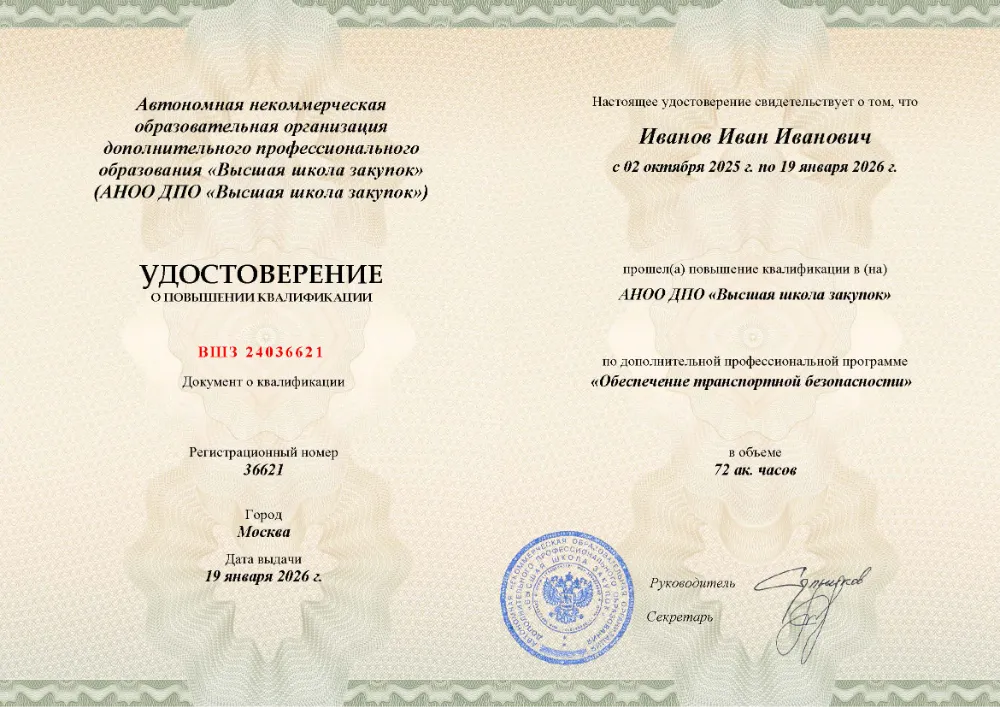 Повышение квалификации, 72 академических часа, 10 модулей: нормативная правовая база и система мер обеспечения транспортной безопасности, планирование и реализация защитных мероприятий, информационное обеспечение и государственный контроль, оценка состояния защищенности объектов. Онлайн-обучение в в Луганске с итоговой аттестацией.